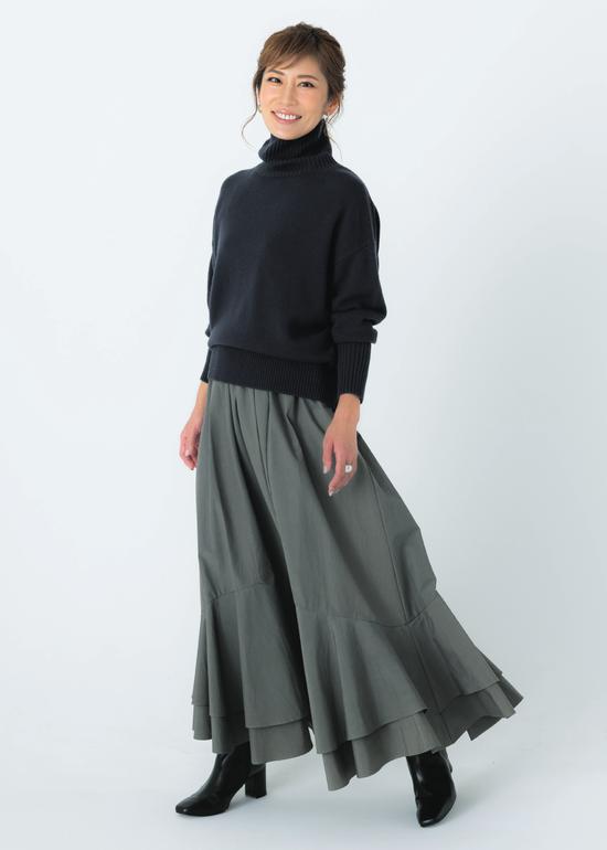 对于肩宽的人来说,如果袖子有下垂感的话,不仅穿起来舒服,还很显瘦。为成熟女性的休闲搭配添加了随意感。拼接处使裙子的下摆不会太过宽大,还能够调整荷叶裙摆的量,整体轮廓很有女人味,不会太过甜美,很适合成熟女性。